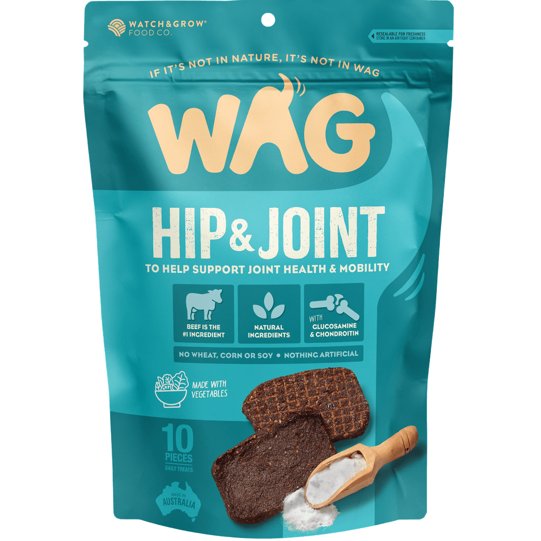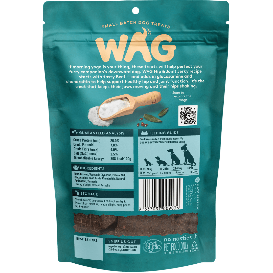 Support your dog's mobility with WAG Beef Jerky Hip And Joint Dog Treats. These treats blend tasty beef with glucosamine & chondroitin for healthy joints. Ideal for active or senior dogs.
