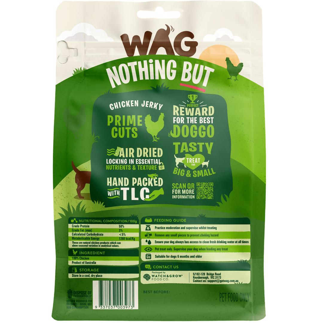 Reward your dog with WAG Chicken Breast Dog Treats. These lean, single-ingredient chicken delights are perfect for training or as a healthy snack for dogs of all ages and sizes.