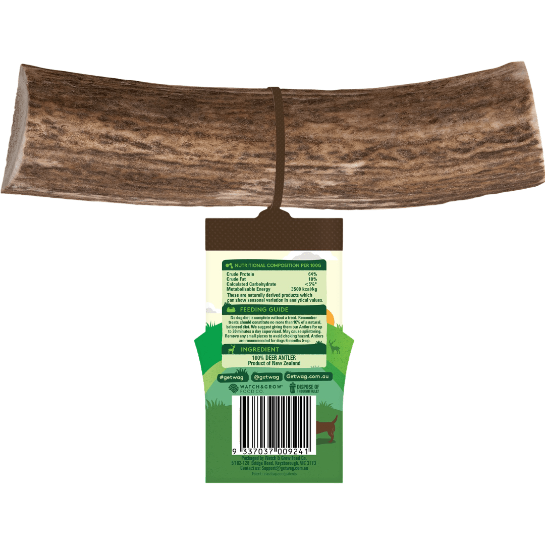 WAG Dog Treats Antler Split offers a natural chew for your dog. Sourced from naturally shed deer antlers and split for easier access to the nutrient-rich marrow, this long-lasting treat promotes dental health for light to medium chewers