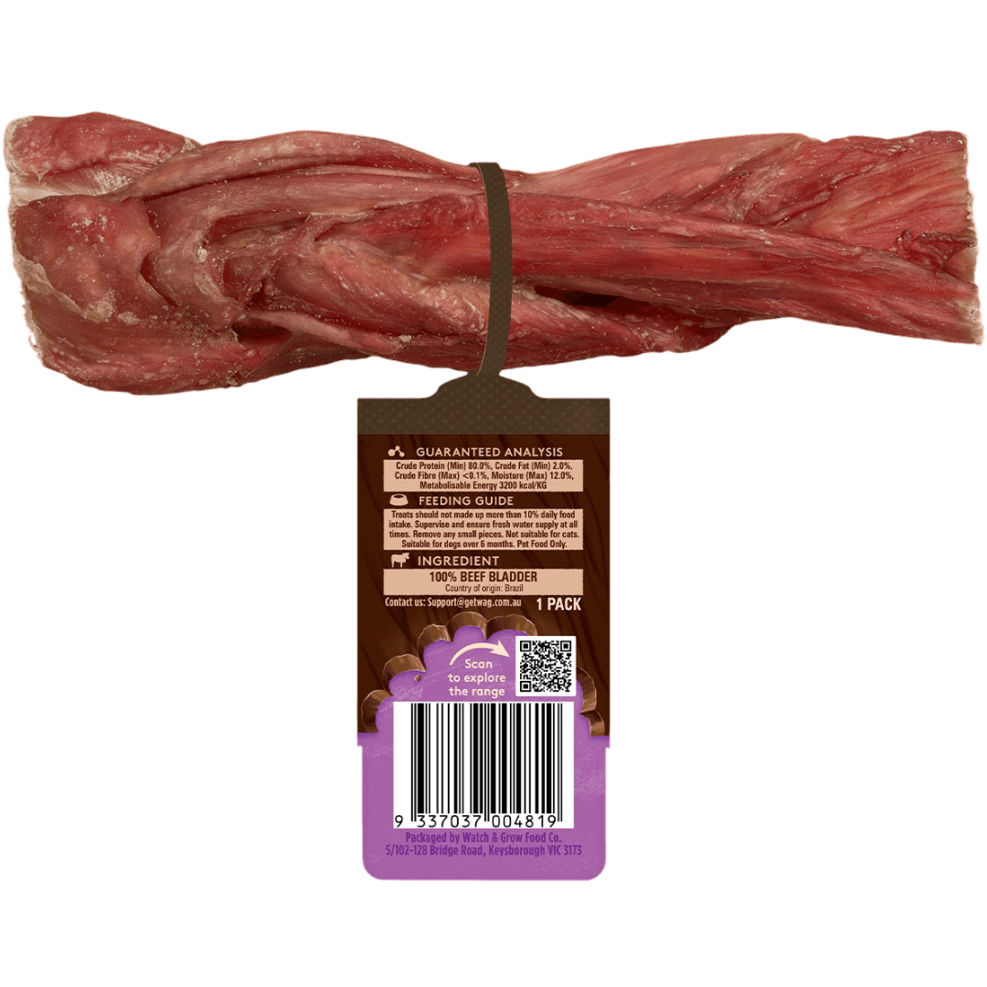 This WAG Dog Treats Braided Bully Stick Regular is a long-lasting, 100% beef pizzle chew. Its braided design offers extra chew time, promoting dental hygiene and satisfying instincts without grains or artificial additives.