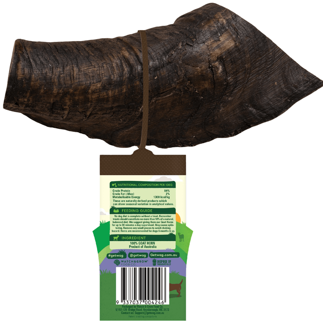 Give your dog a natural way to chew, clean their teeth, and stay occupied with the WAG Goat Horn. This tough, long-lasting chew helps support dental health and satisfies chewing instincts-without any additives, preservatives, or mess. Available in a range of sizes to suit dogs big and small. Ideal for moderate to strong chewers looking for a high-value, low-fuss treat.