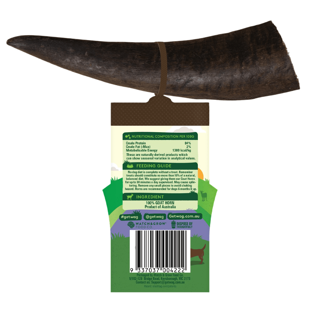 Give your dog a natural way to chew, clean their teeth, and stay occupied with the WAG Goat Horn. This tough, long-lasting chew helps support dental health and satisfies chewing instincts-without any additives, preservatives, or mess. Available in a range of sizes to suit dogs big and small. Ideal for moderate to strong chewers looking for a high-value, low-fuss treat.