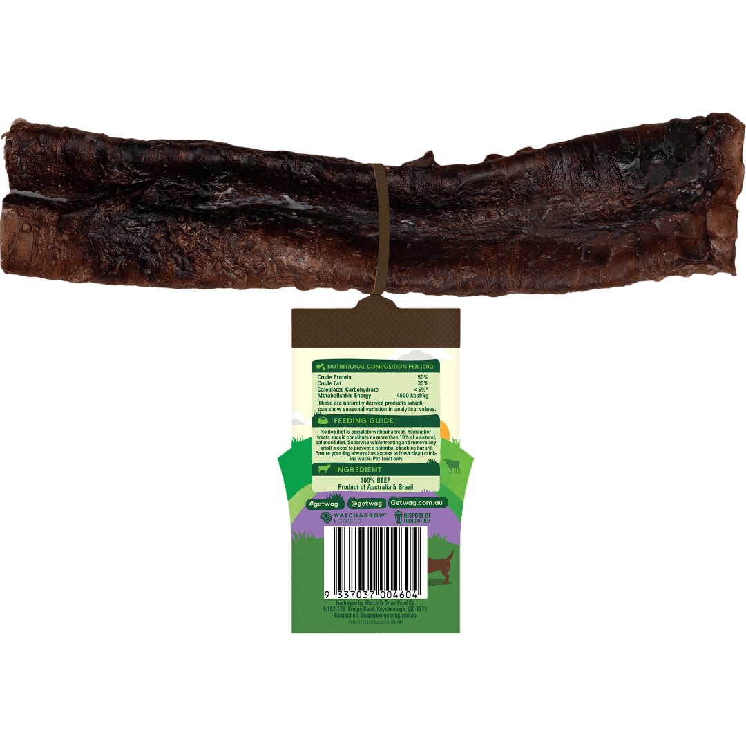Treat your dog with the WAG Dog Treats Moo Tube. This air-dried beef windpipe promotes dental health and provides joint support, offering a delicious boredom-buster your dog will love.
