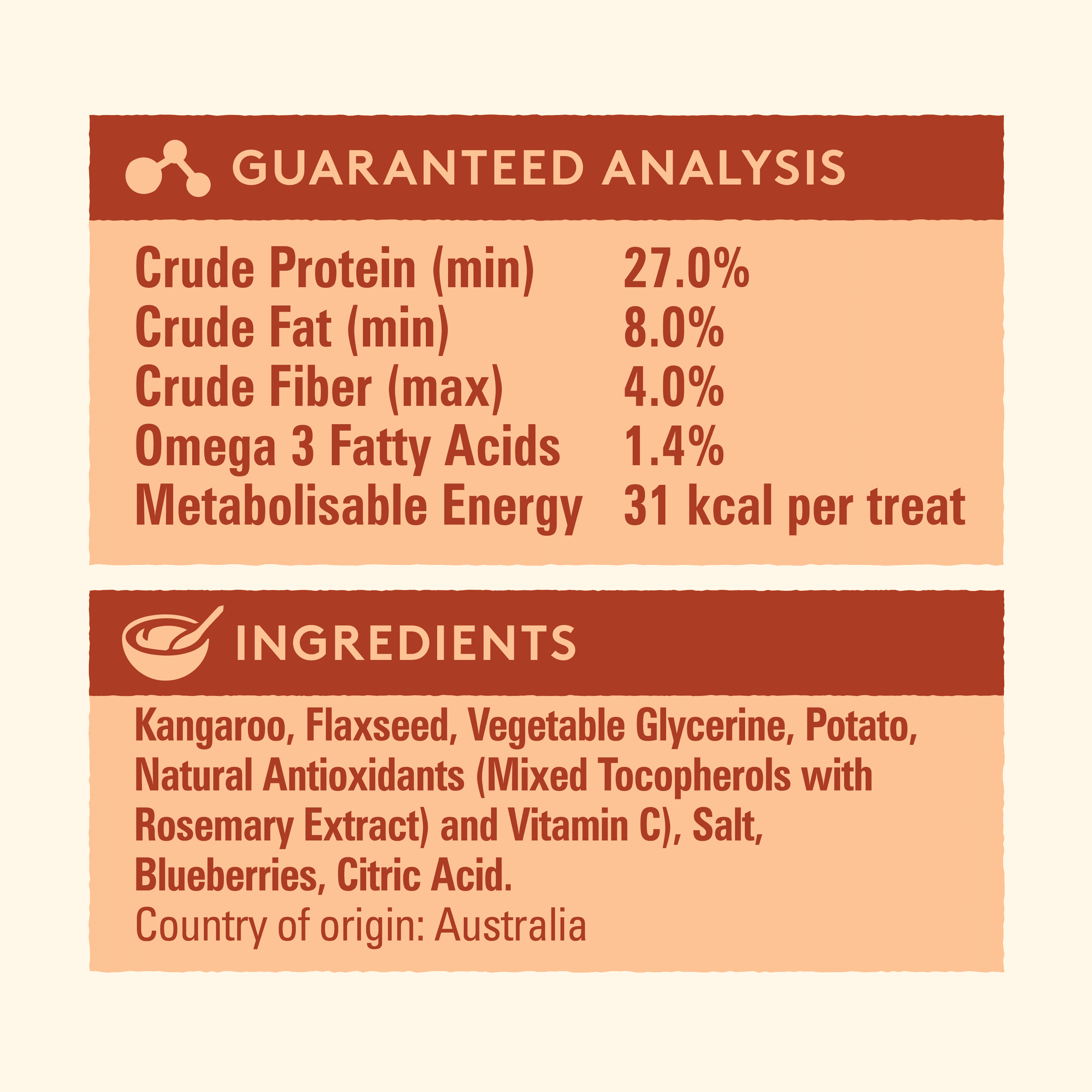 Kangaroo, Linseed, Vegetable Glycerin, Potato, Salt, Berries [Blueberries & Cranberries], Food Acids, Chia, Natural Antioxidant, Turmeric