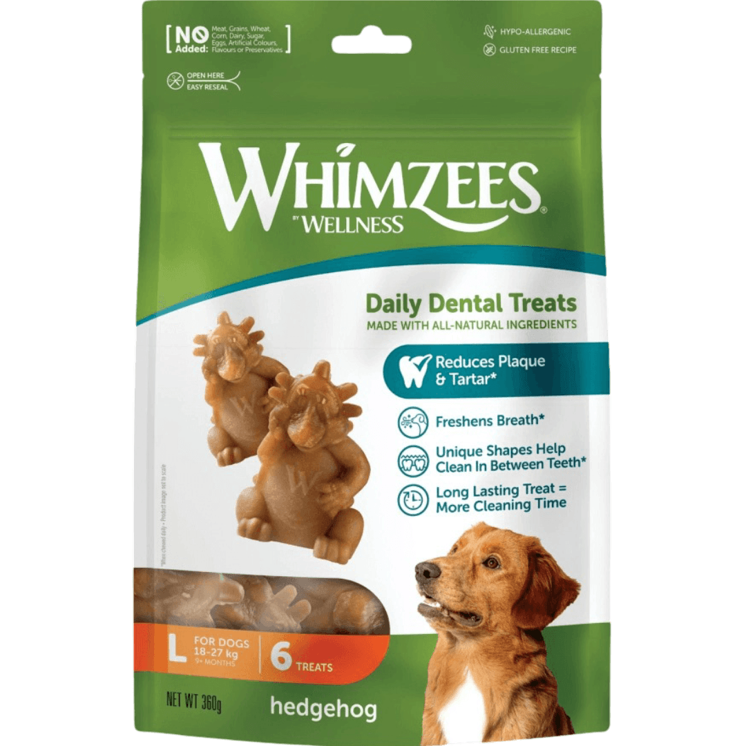 Whimzees Hedgehog Large Dental Dog Treats offer a fun and functional way to support your dog's oral health. Shaped like a playful hedgehog named Herman, these all-natural chews are designed to clean teeth, freshen breath, and keep daily dental care enjoyable for your pup.