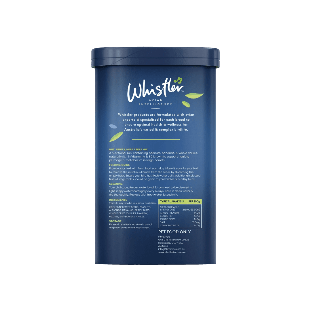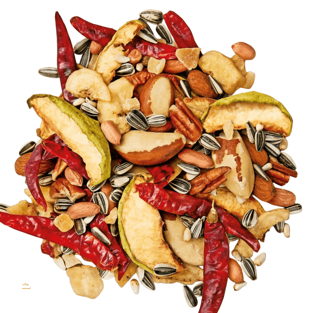 Grey sunflower seeds, peanuts, almonds, bananas, Brazil nuts, whole dried chillies, pawpaw, pecans, safflowers, apples. Formula may vary due to seasonal availability