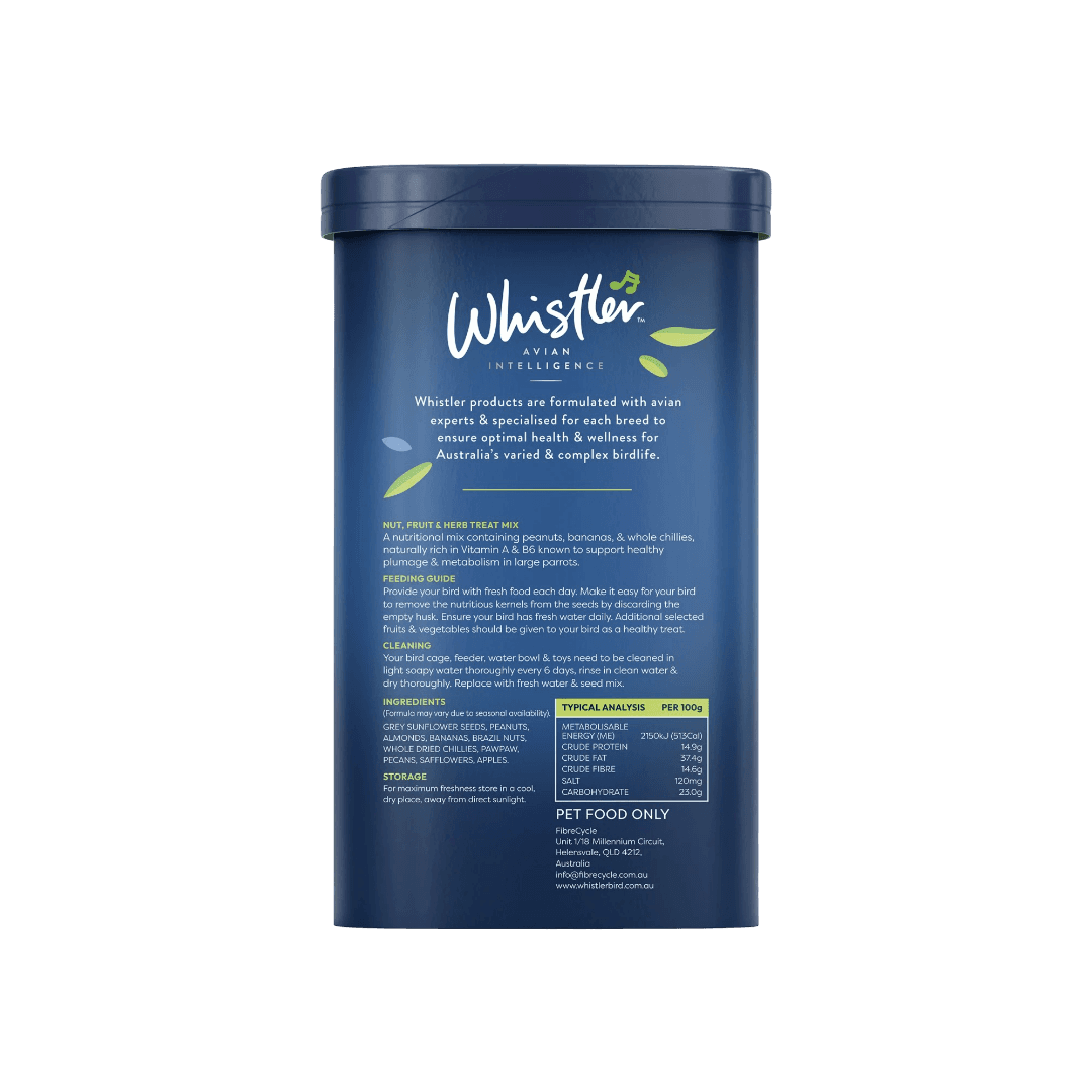 The Whistler Exotic Large Parrot Nut Fruit And Herb Treat Mix is ideal for medium to large exotic parrots, including Amazon parrots, African grey parrots, macaws, and conures