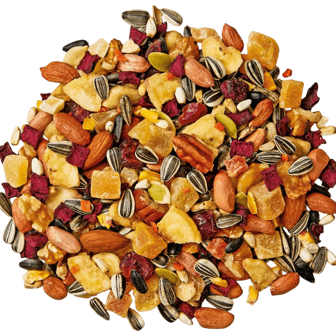 Grey sunflower seeds, banana, peanuts, carrot, beetroot, corn, pumpkin seeds, safflower, pawpaw, pecans, walnuts, almonds, black sunflower seeds, cranberries, mangoes, dandelion, sage. Formula may vary due to seasonal availability