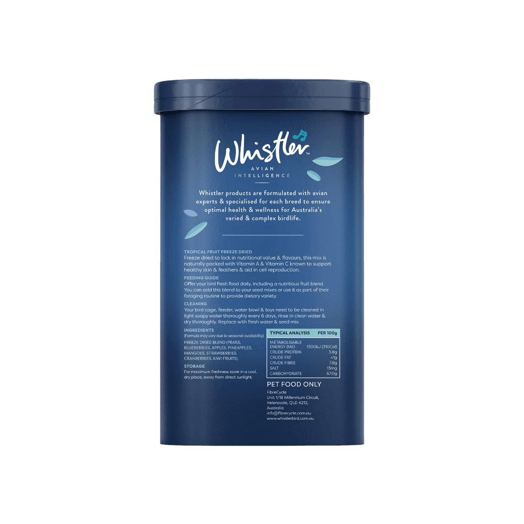 Freeze dried blend (pears, blueberries, apples, pineapples, mangoes, strawberries, cranberries, kiwi fruits). Formula may vary due to seasonal availability