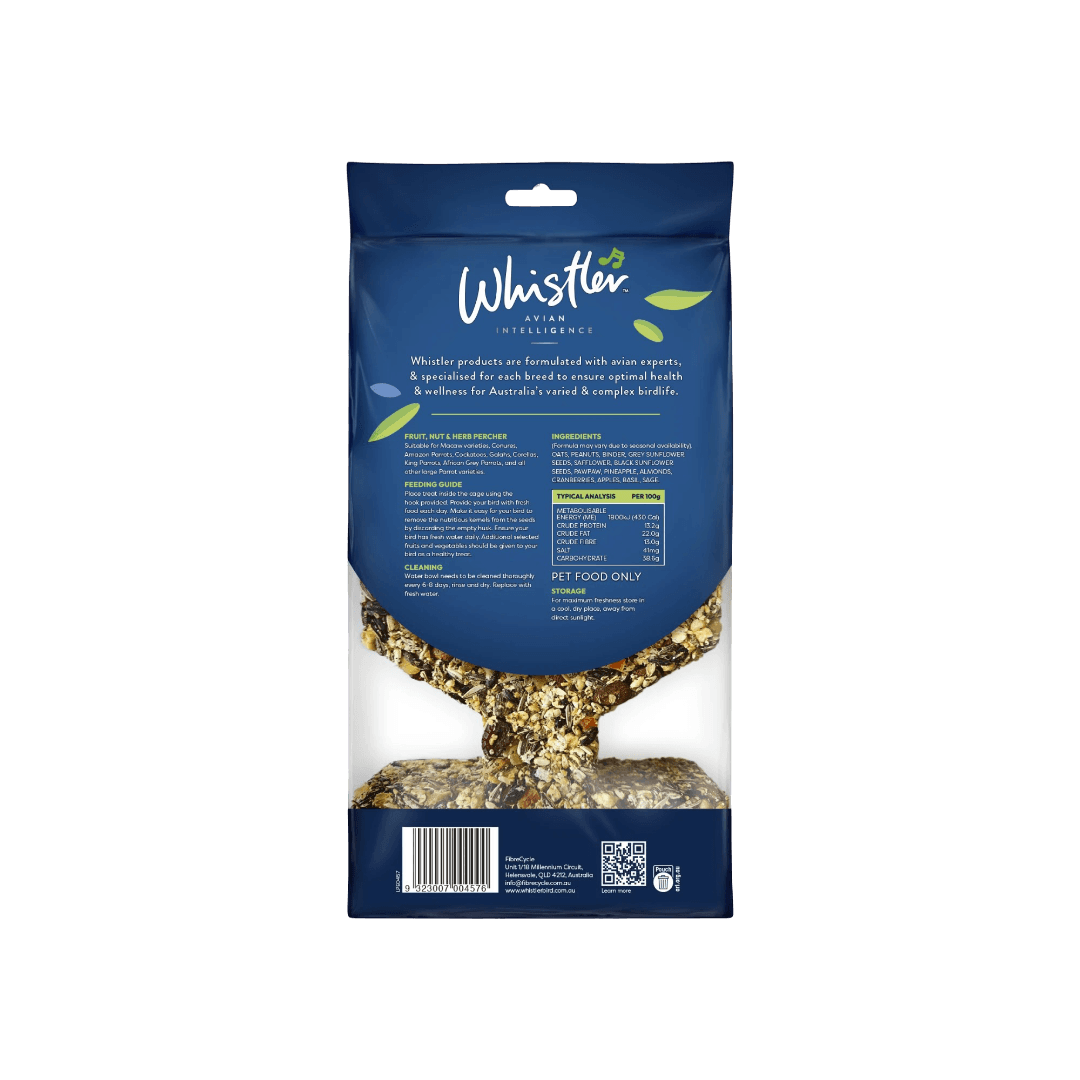 The Whistler Large Parrot Nut Fruit And Herb Hanging Percher Treat is a dual-purpose item for large parrots, offering both nutritional benefits and enrichment. Designed to optimize feather growth and regulate the immune system
