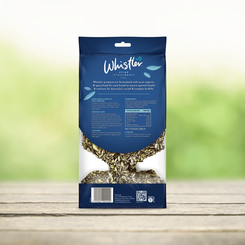 The Whistler Medium And Large Parrot Hanging Percher Treat is formulated with a blend including bananas, peppermint, and cranberries, with naturally occurring Manganese and Vitamin A, known for healthy metabolism, immune function and tissue growth.