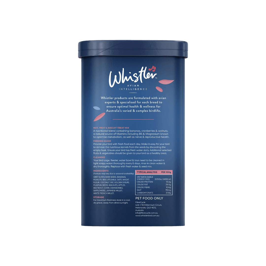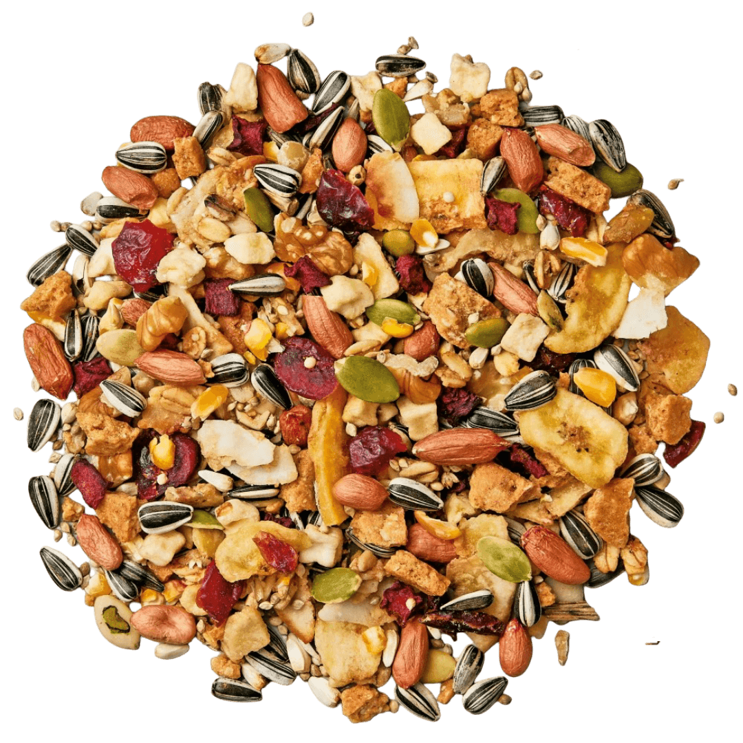 Grey sunflower seeds, bananas, peanuts, biscuits (milk, oats, wheat flour, coconut, fat, golden syrup), pumpkin seeds, walnuts, apples, beetroot, corn, cranberries, safflowers, Japanese millet, white French millet. Formula may vary due to seasonal availability