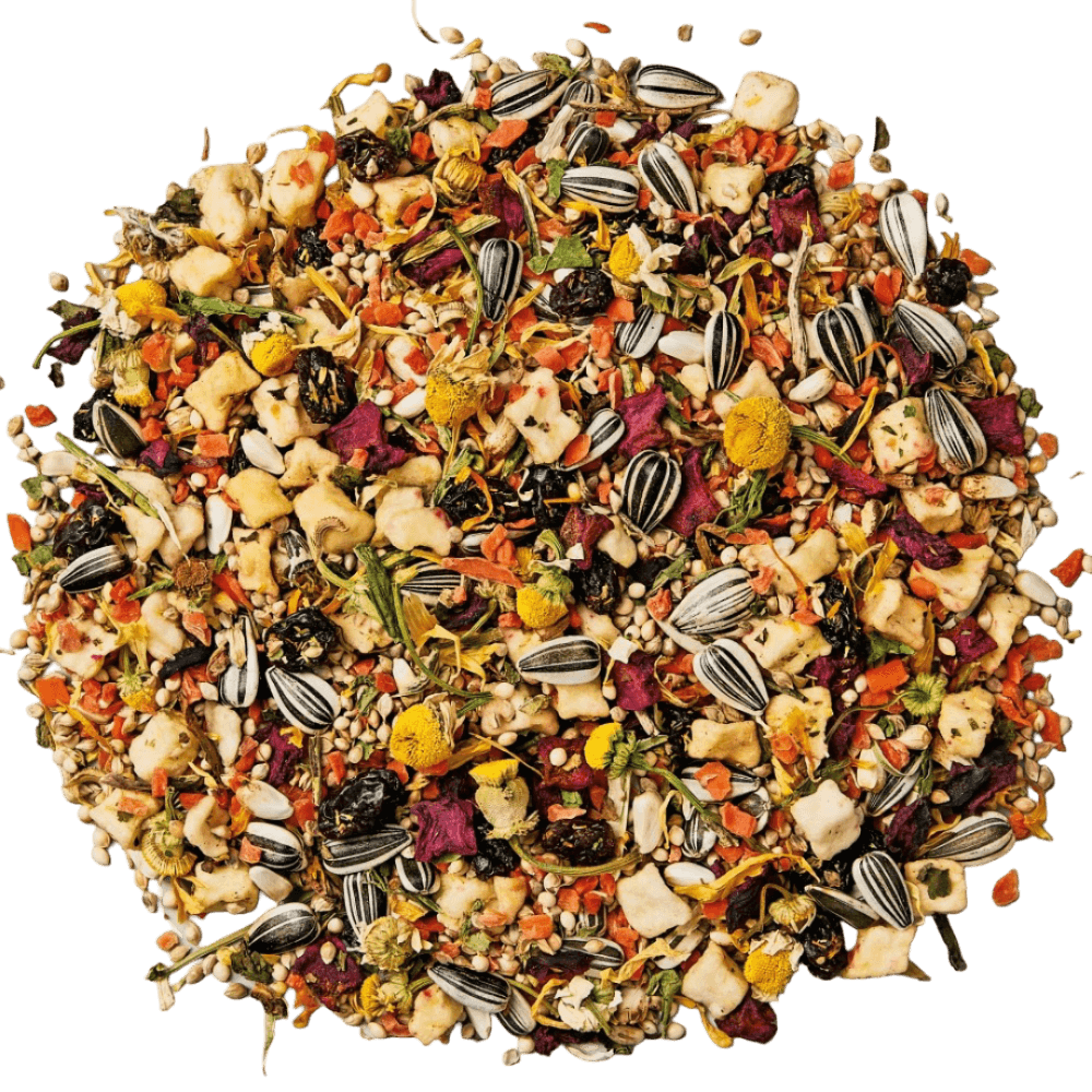 Carrots, beetroot, currants, apples, grey sunflower seeds, Japanese millet, white French millet, safflowers, dandelion, calendula and chamomile. Formula may vary due to seasonal availability