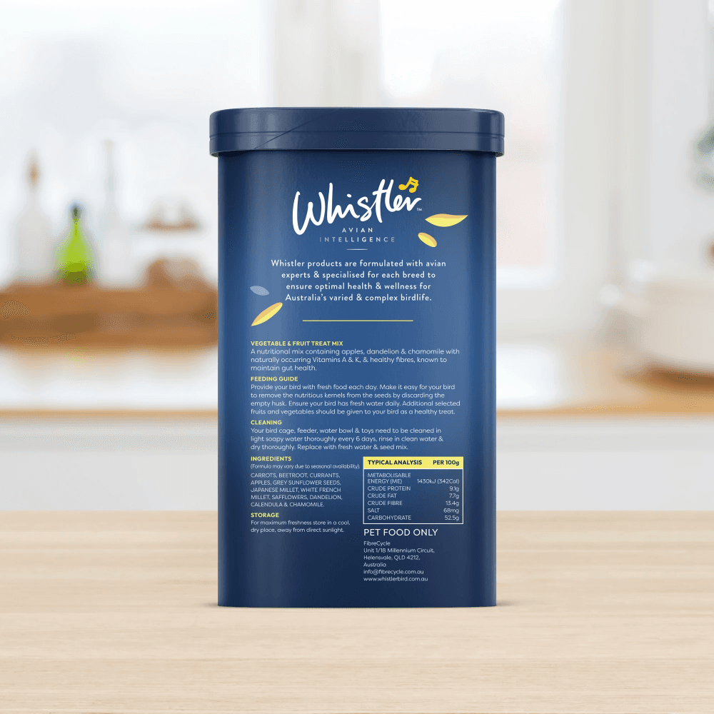 Treat your small parrot to a burst of natural goodness with Whistler's Vegetable & Fruit Treat Mix. This fibre-rich blend delivers vitamins A and K to support gut health and happy, active birds