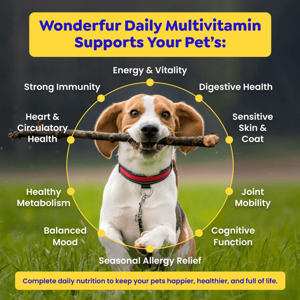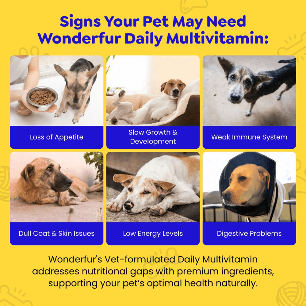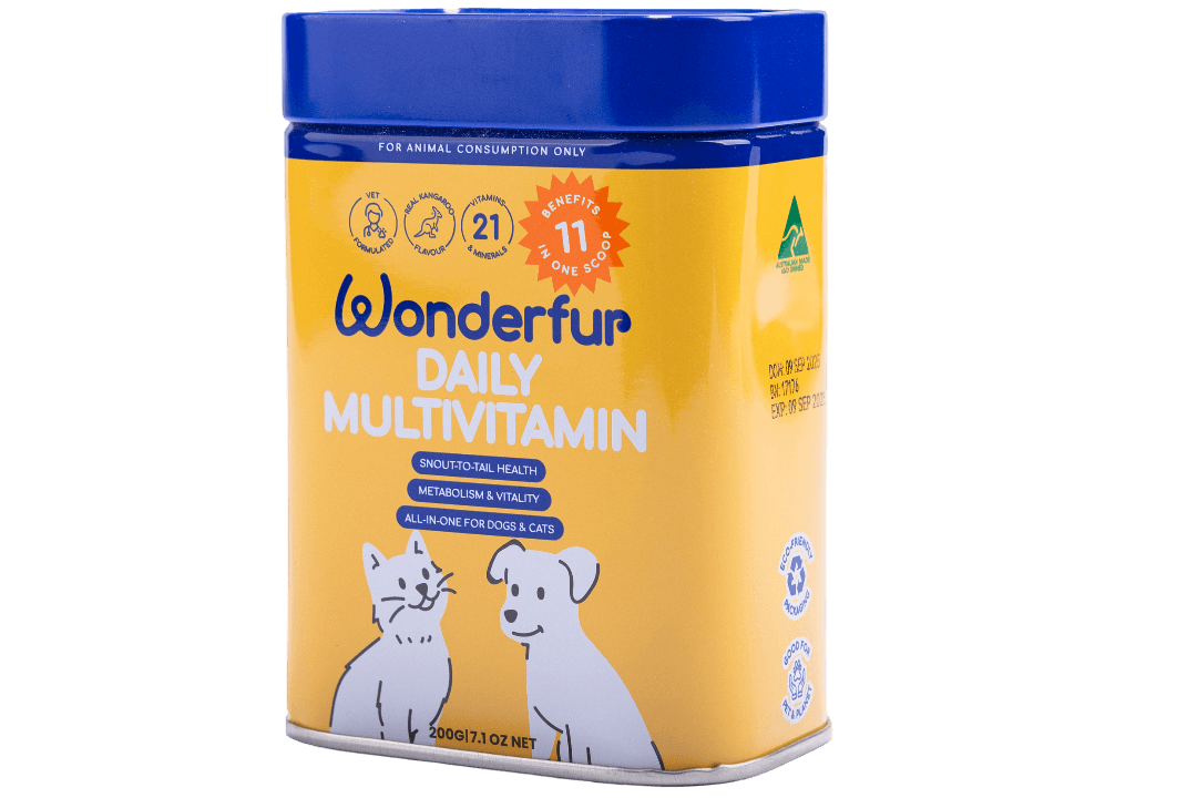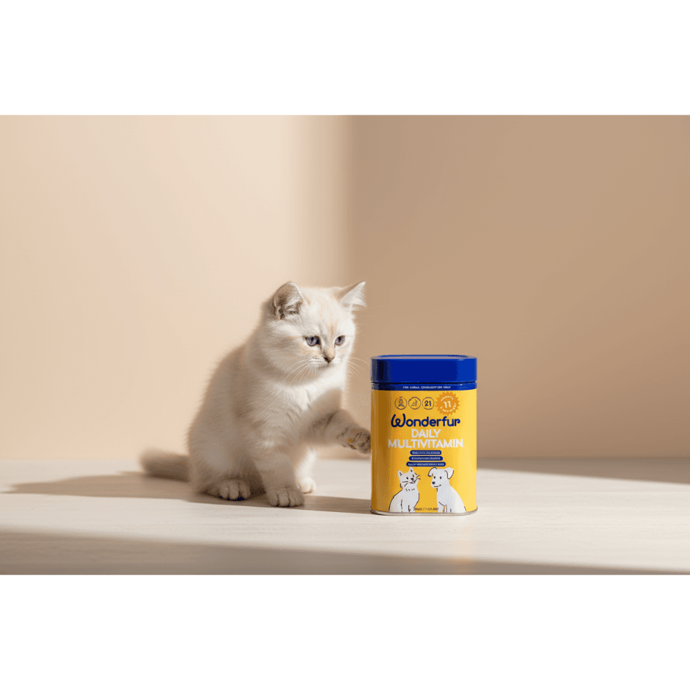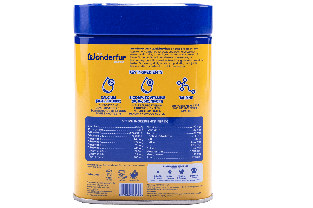 The Wonderfur Daily Multi Vitamin Powder For Dogs And Cats is an all-in-one daily supplement designed to fill dietary gaps and support your pet's overall health. It provides a balanced blend of essential vitamins, minerals, and dual-source calcium to complement raw, home-cooked, or low-variety diets.