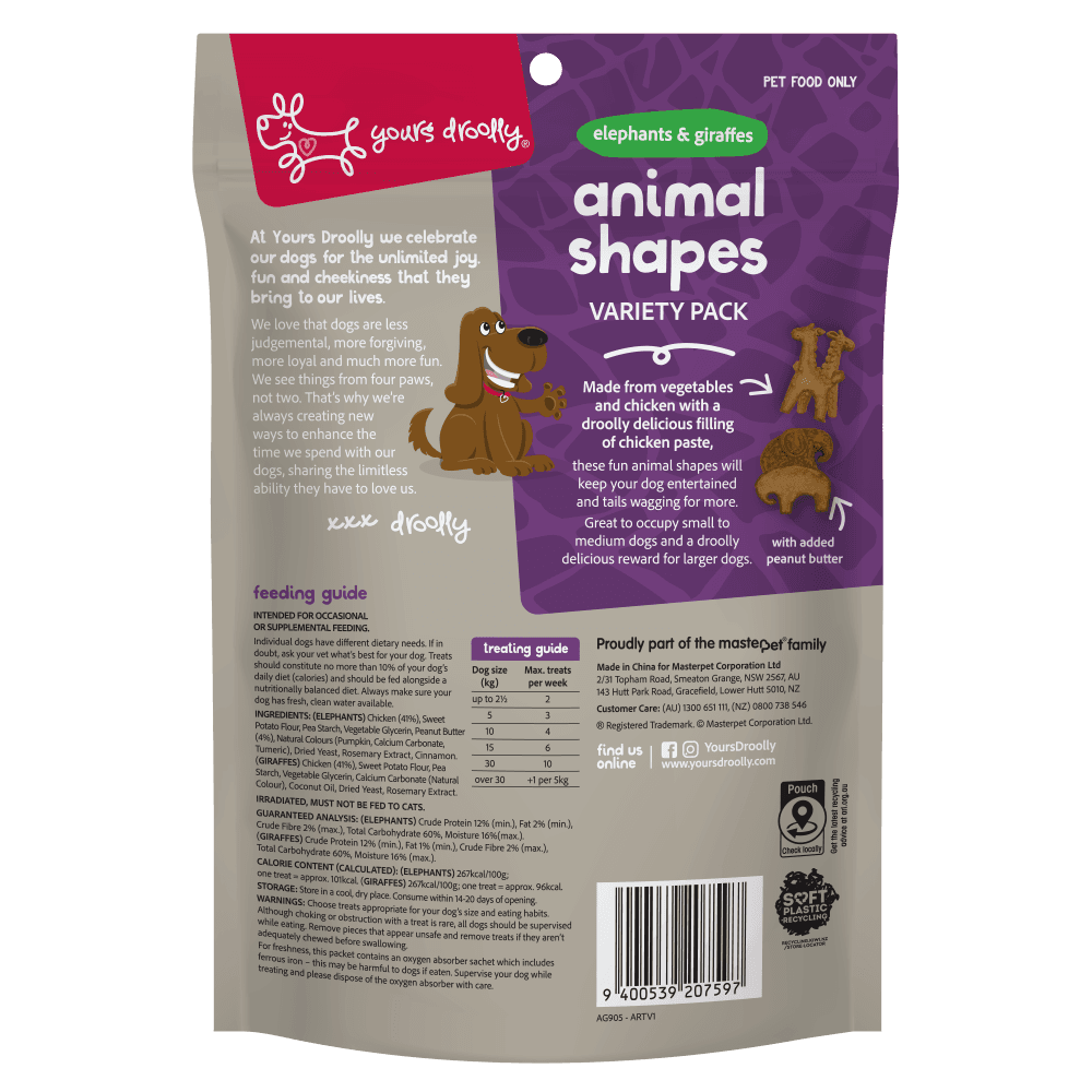The Yours Droolly Chicken Paste Filled Animal Shapes Variety Dog Treats offer a playful and engaging chewing experience designed to keep your pet entertained for longer. This variety pack features whimsical elephant and giraffe shapes crafted from a blend of vegetables and protein, each concealing a savoury chicken paste centre that rewards your dog as they chew.