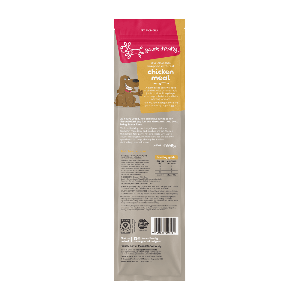 The Yours Droolly Chicken Wrapped Large Sticks Dog Treats are substantial, long-lasting chews designed to keep big dogs engaged and satisfied. Each extra-long stick features a vegetable-based core wrapped in authentic chicken jerky to provide a tasty and mentally stimulating experience for your pet.