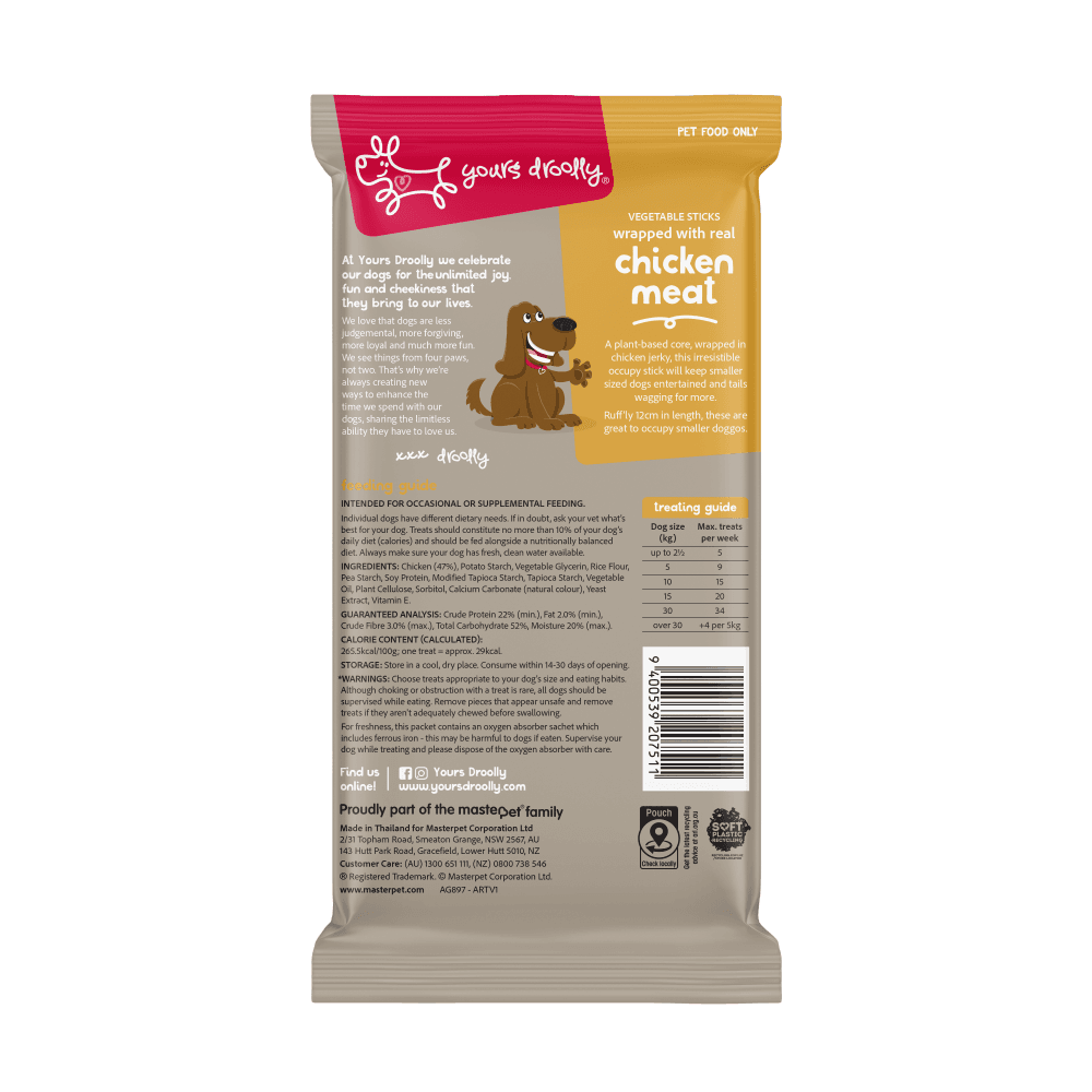Yours Droolly Dog Chicken Wrapped Small Sticks are a delicious and engaging treat designed for small breed dogs of all lifestages. These dual-texture sticks feature a plant-based core wrapped in real chicken breast meat, providing a low-fat enrichment snack that supports dental health by encouraging natural chewing behaviour.