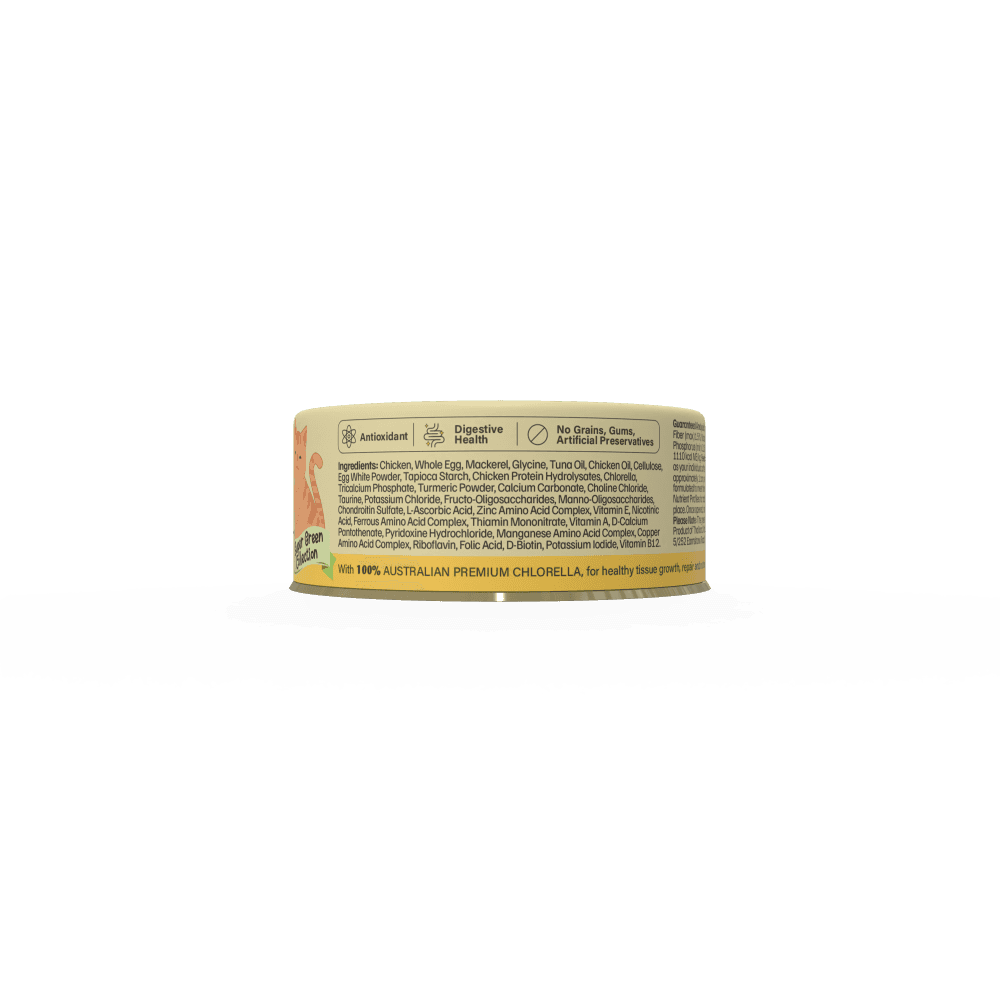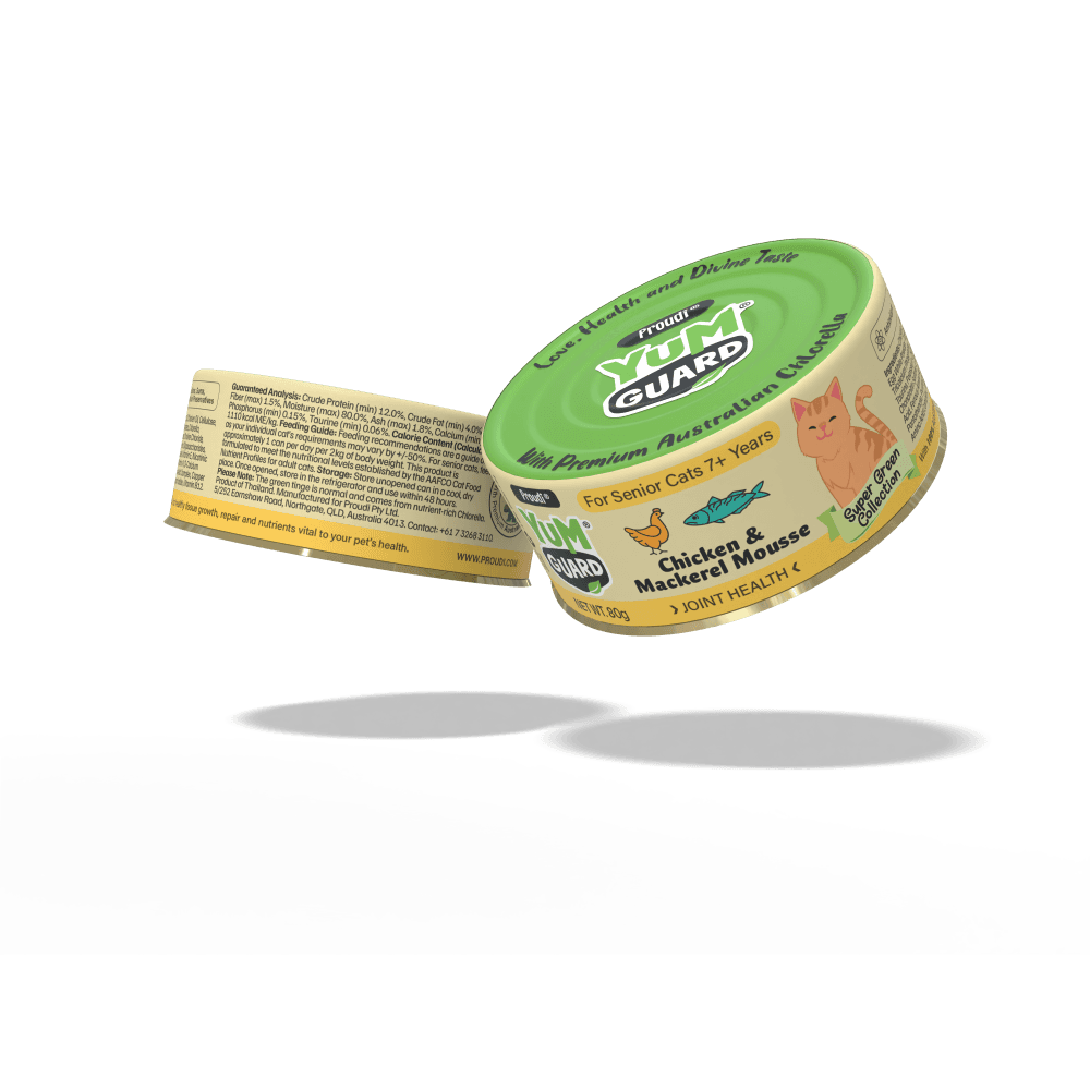 YumGuard Super Green Joint Health Chicken & Mackerel Senior Wet Cat Food Can is a complete and balanced wet meal specially formulated to support the mobility of aging cats. This smooth chicken and mackerel mousse features Chondroitin sulfate and Australian Chlorella to repair joint wear and promote tissue growth in senior felines.