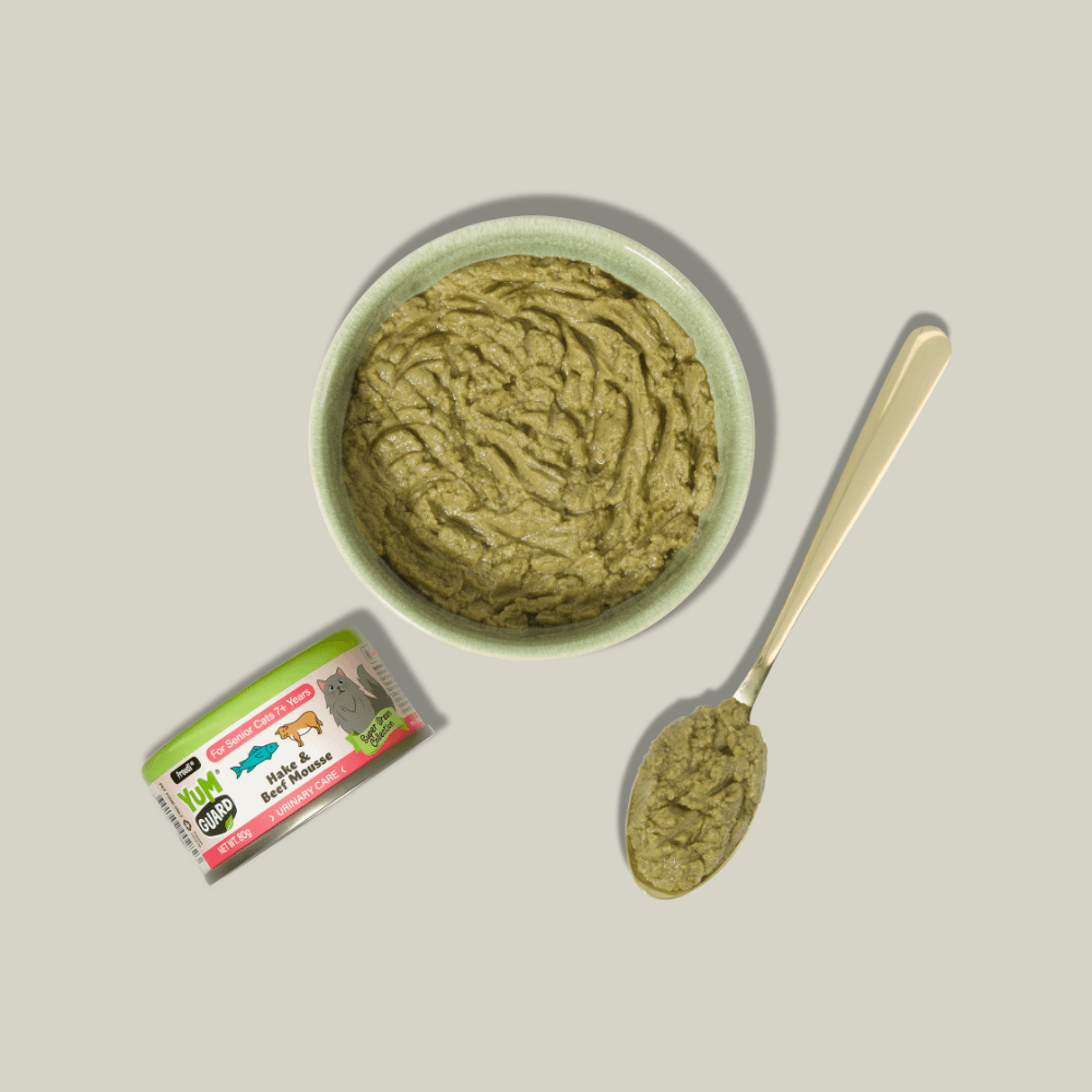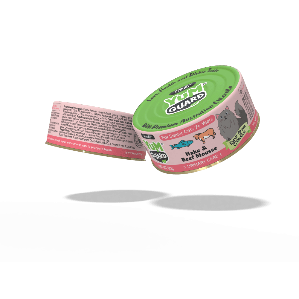 YumGuard Super Green Urinary Care Hake & Beef Senior Wet Cat Food is a complete and balanced wet meal designed to support the specific health needs of aging cats. This smooth hake and beef mousse is vet-formulated with Australian Chlorella and functional superfoods like cranberries to promote urinary tract health and maintain kidney function in senior felines.