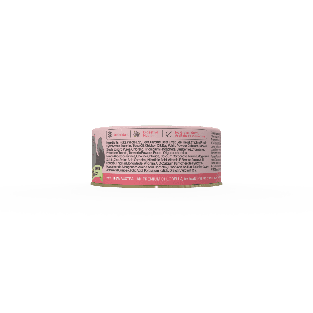 Hake, Whole Egg, Beef, Glycine, Beef Liver, Beef Heart, Chicken Protein Hydrolysates, Zucchini, Tuna Oil, Chicken Oil, Egg White Powder, Cellulose, Tapioca Starch, Banana Puree, Chlorella, Tricalcium Phosphate, Blueberries, Cranberries, Potassium Chloride, Turmeric Powder, Fructo-Oligosaccharides, Manno-Oligosaccharides, Choline Chloride, Calcium Carbonate, Taurine, Magnesium Sulfate, Zinc Amino Acid Complex, Nicotinic Acid, Vitamin E, Ferrous Amino Acid Complex, Thiamin Mononitrate, Vitamin A, D-Calcium Pantothenate, Pyridoxine Hydrochloride, Manganese Amino Acid Complex, Riboflavin, Sodium Selenite, Copper Amino Acid Complex, Folic Acid, Potassium Iodide, D-Biotin, Vitamin B12.