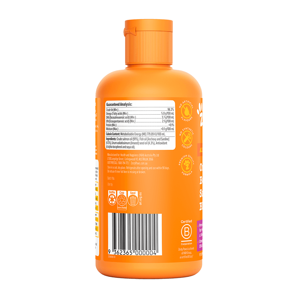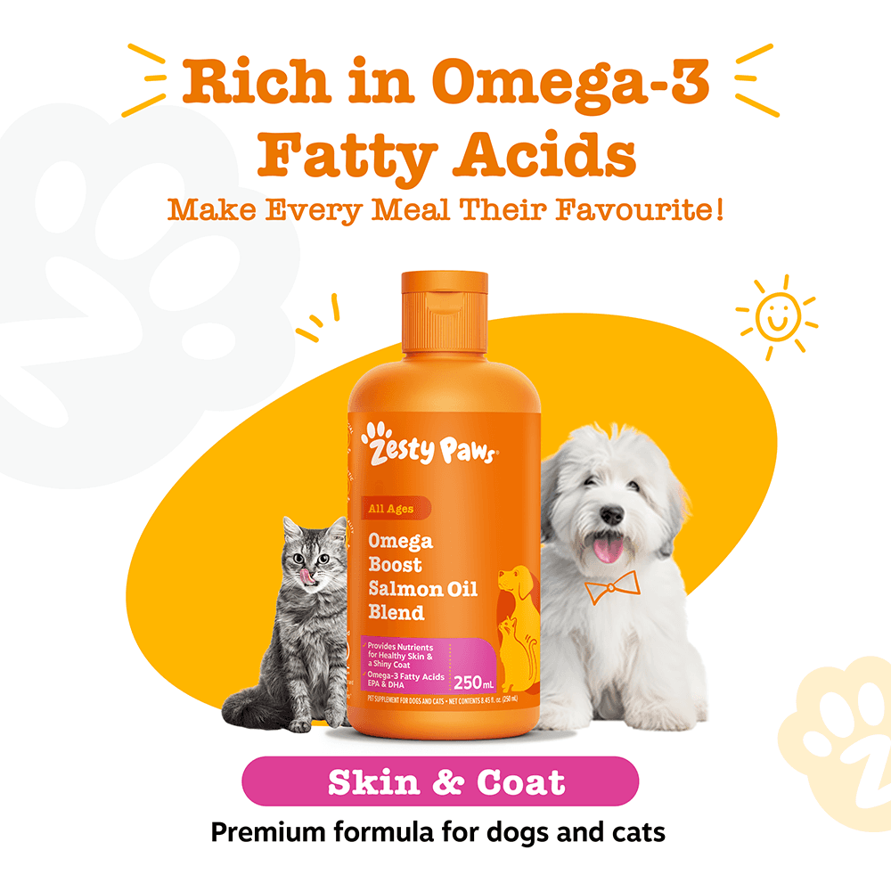 The Zesty Paws Omega Boost Salmon Oil Blend For Dogs And Cats is a premium liquid food topper formulated to enhance your pet's mealtime with a delicious flavour while providing essential Omega fatty acids. This supplement is a rich source of Omega-3s, specifically EPA and DHA, that work to support healthy skin, a beautiful coat, and overall pet wellness.