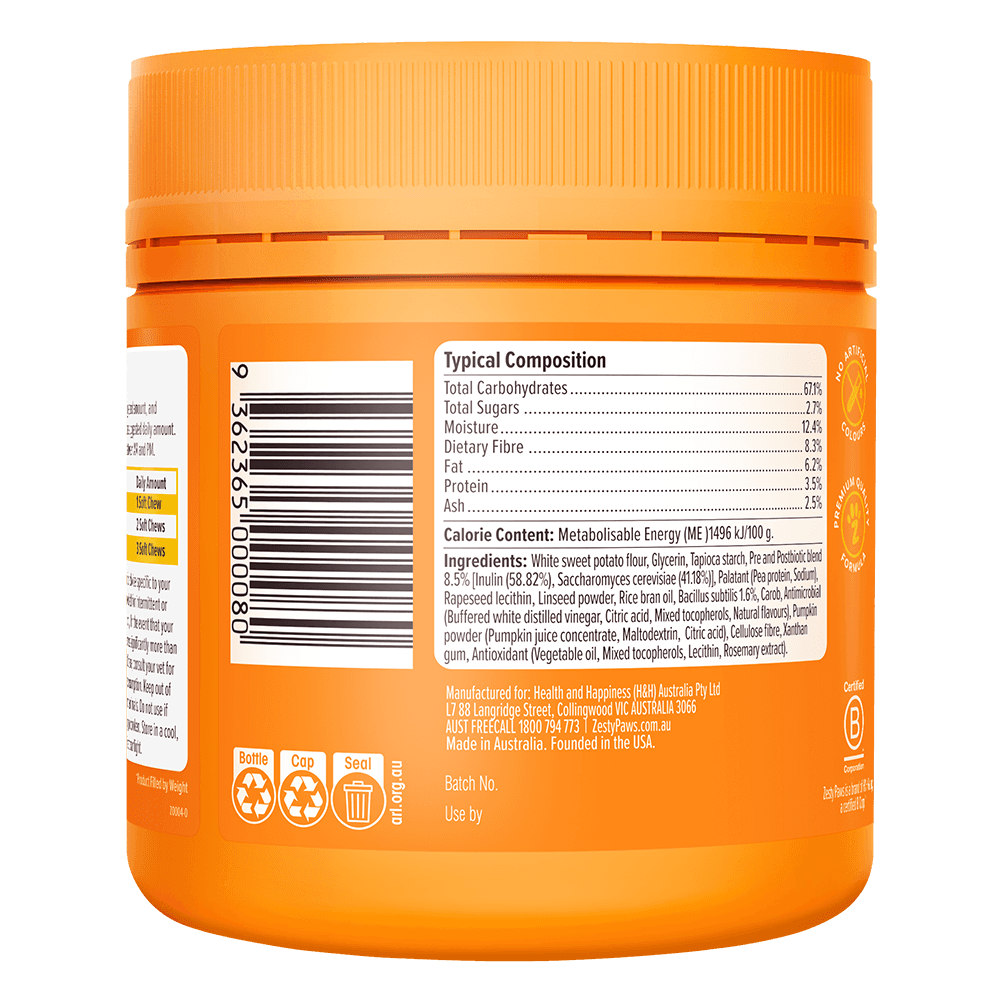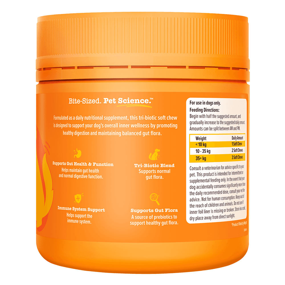 Zesty Paws Pre, Post and Probiotic Chews for Dogs are a premium digestive support supplement designed to maintain a healthy gut microbiome and robust immune function. These Australian-made chewables feature a specialised tri-biotic blend to help nourish beneficial gut bacteria and support overall canine wellbeing.