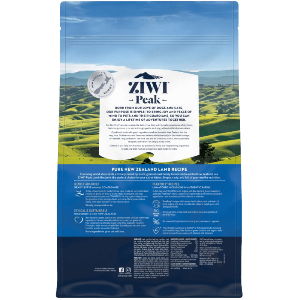Crafted with care for your feline, the ZIWI Peak Lamb Air Dried Cat Food provides a nutritious, moisture-rich diet that mimics the natural prey diet of carnivorous cats. Using unique air-drying, it locks in goodness from 96% lamb & green mussels. Ideal for all life stages, supporting overall health for discerning cats.