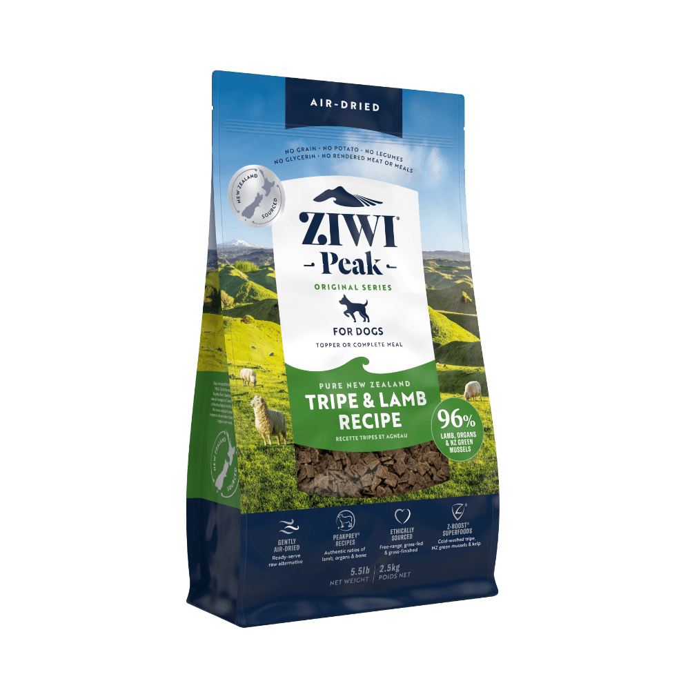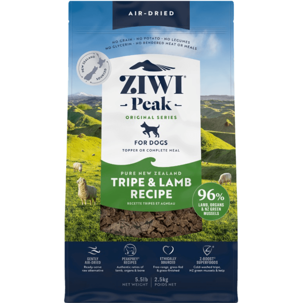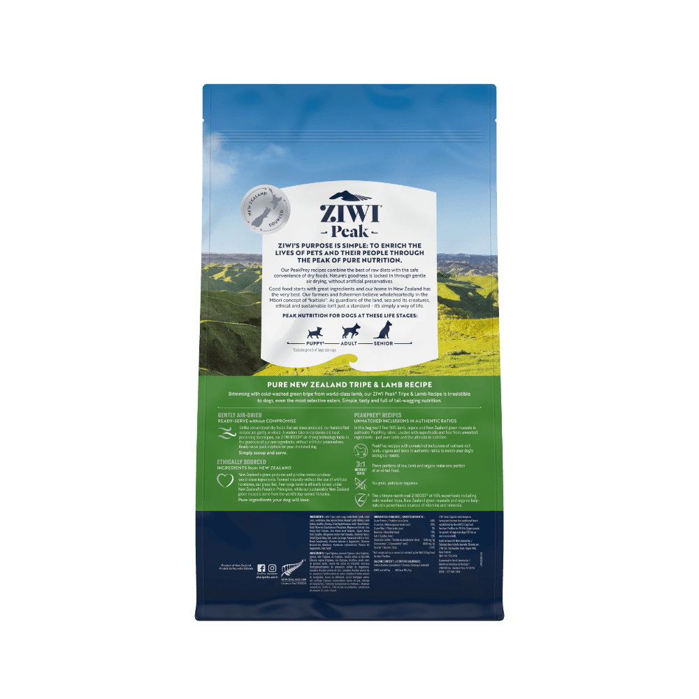 ZIWI Peak Air Dried Tripe and Lamb Dry Dog Food offers a premium blend of high-quality tripe and free-range lamb, providing your dog with a nutrient-packed and delicious meal. This air-dried recipe is rich in protein and supports overall health, with a focus on quality and digestibility for dogs of all sizes.