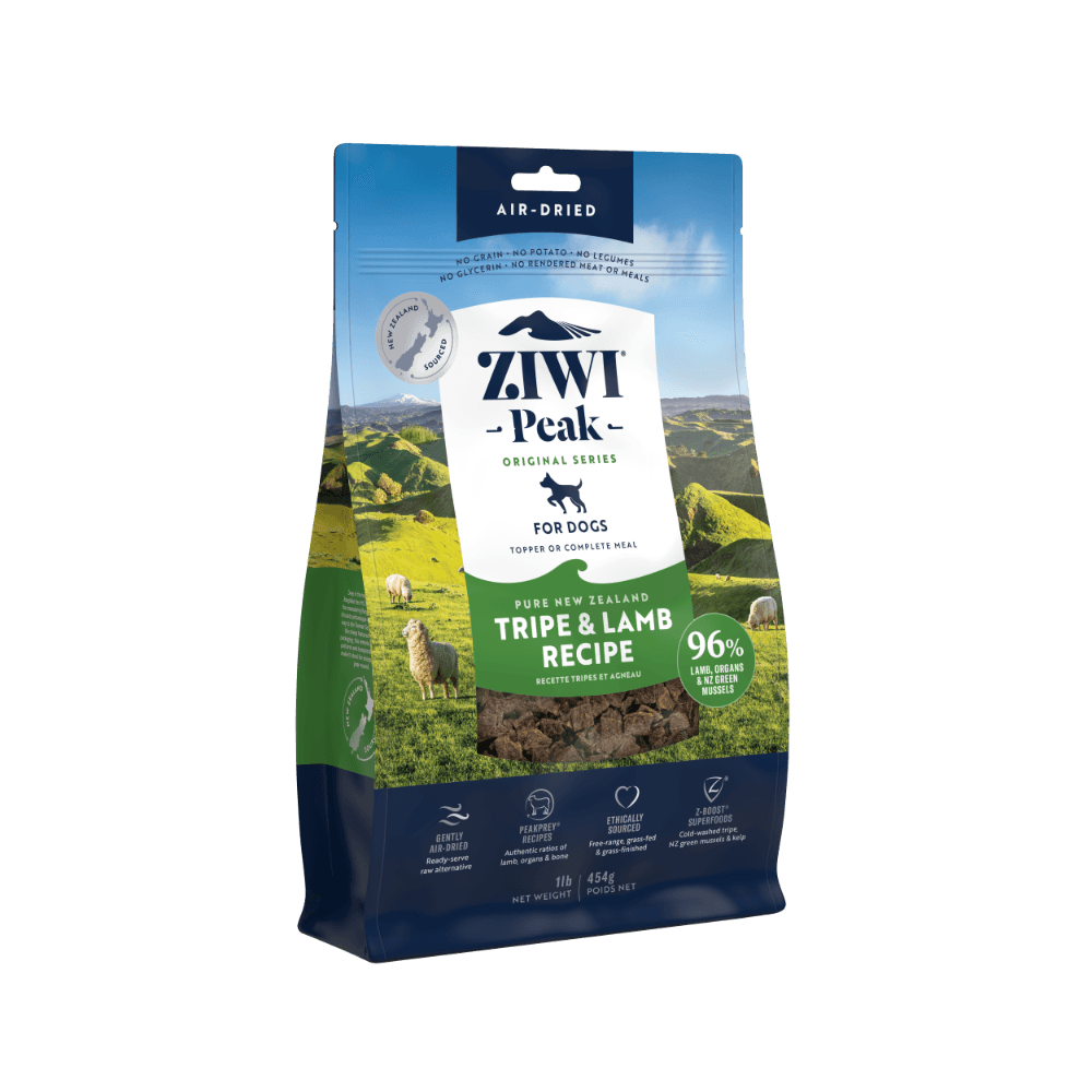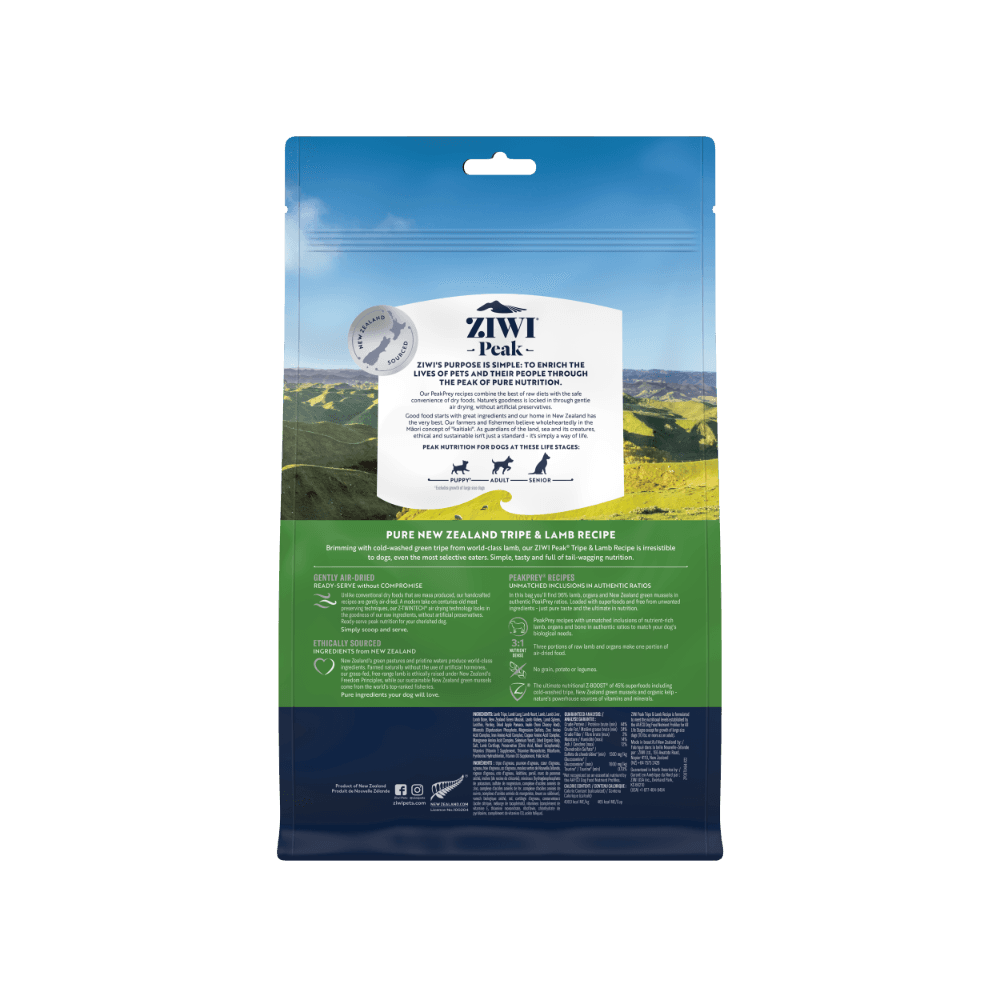 ZIWI Peak Air Dried Tripe and Lamb Dry Dog Food offers a premium blend of high-quality tripe and free-range lamb, providing your dog with a nutrient-packed and delicious meal. This air-dried recipe is rich in protein and supports overall health, with a focus on quality and digestibility for dogs of all sizes.