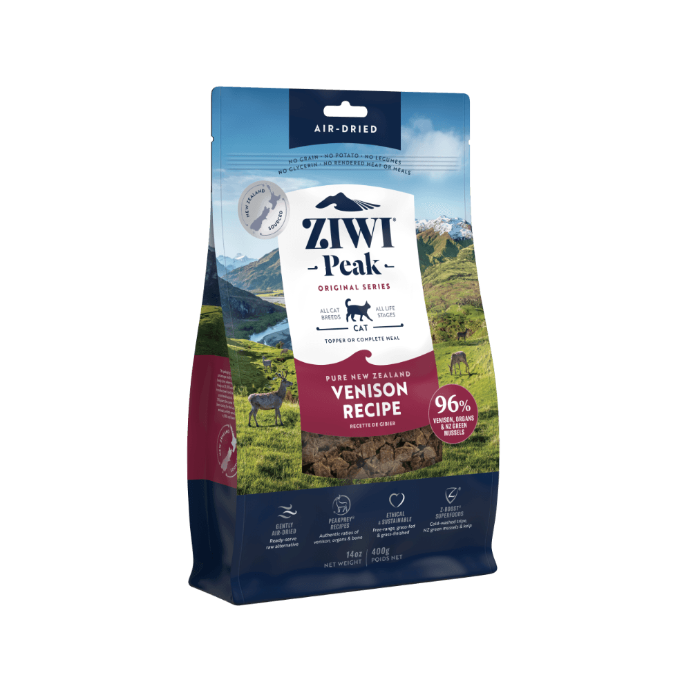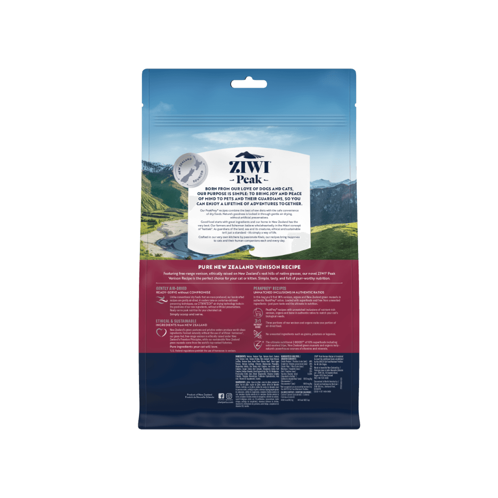 Venison, Venison Tripe, Venison Heart, Venison Lung, Venison Liver, Venison Kidney, New Zealand Green Mussel, Venison Bone, Lecithin, Inulin (from Chicory Root), Dried Apple Pomace, Venison Cartilage, Minerals (Dipotassium Phosphate, Magnesium Sulphate, Zinc Amino Acid Complex, Iron Amino Acid Complex, Copper Amino Acid Complex, Manganese Amino Acid Complex, Sodium Selenite), Dried Organic Kelp, Salt, DL-Methionine, Preservative (Citric Acid, Mixed Tocopherols), Vitamins (Choline Chloride, Thiamine Mononitrate, Pyridoxine Hydrochloride, Folic Acid, Vitamin D3 Supplement), Taurine
