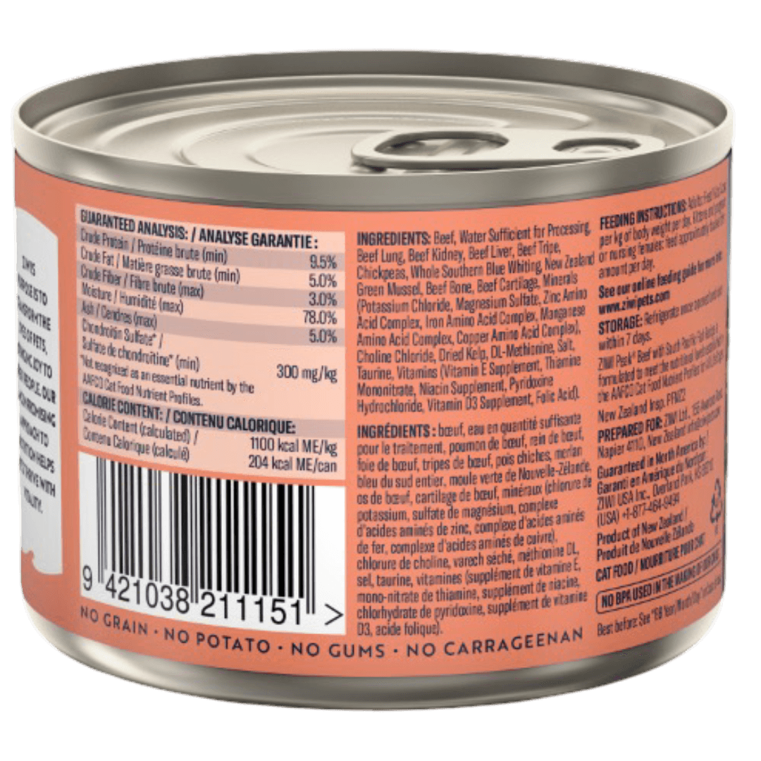 Beef, Water Sufficient for Processing, Beef Lung, Beef Kidney, Beef Liver, Beef Tripe, Chickpeas, Whole Southern Blue Whiting, New Zealand Green Mussel, Beef Bone, Beef Cartilage, Minerals (Potassium Chloride, Magnesium Sulfate, Zinc Amino Acid Complex, Iron Amino Acid Complex, Manganese Amino Acid Complex, Copper Amino Acid Complex), Choline Chloride, Dried Kelp, DL-Methionine, Salt, Taurine, Vitamins (Vitamin E Supplement, Thiamine Mononitrate, Niacin Supplement, Pyridoxine Hydrochloride, Vitamin D3 Supplement, Folic Acid).