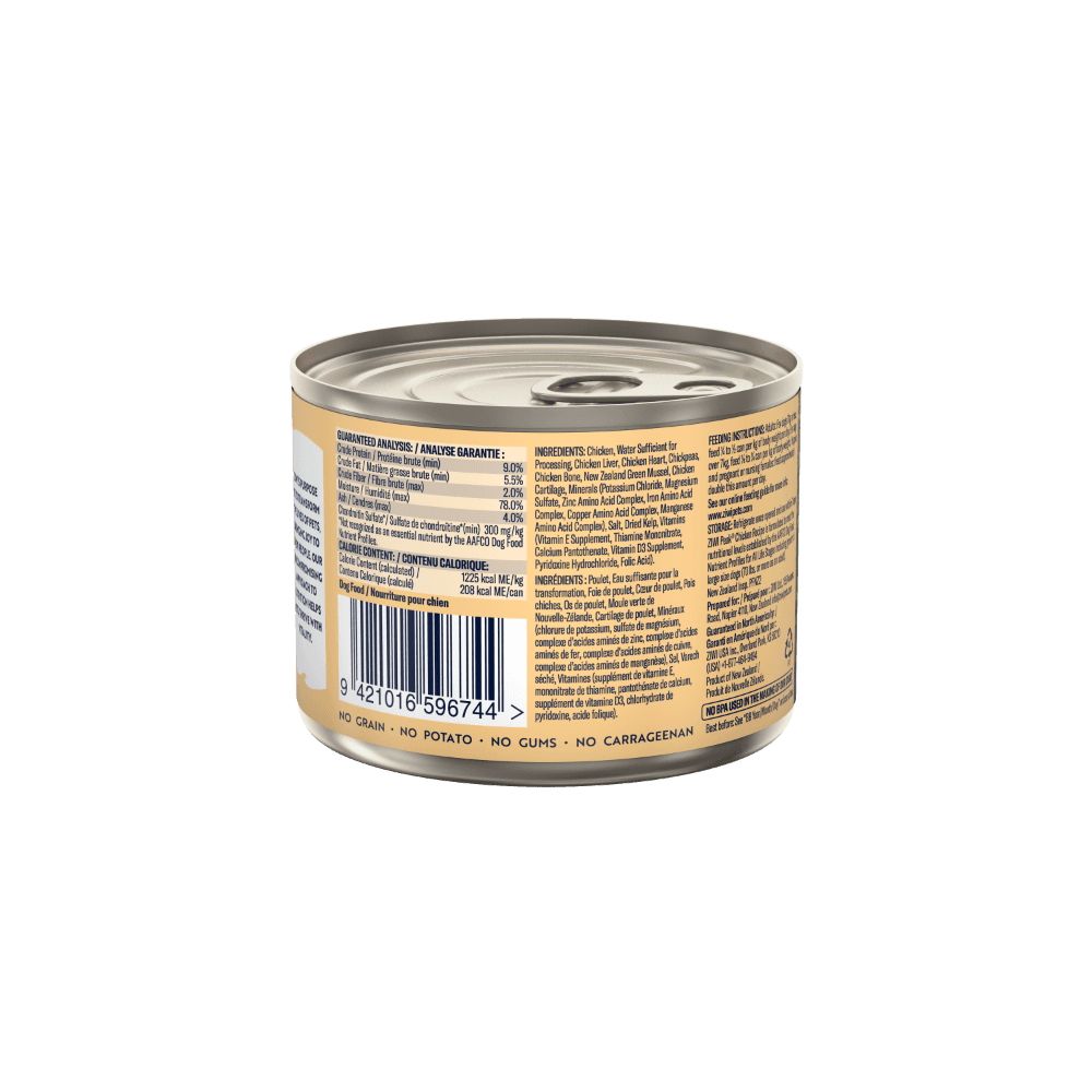 Chicken, Water Sufficient for Processing, Chicken Liver, Chicken Heart, Chickpeas, Chicken Bone, New Zealand Green Mussel, Chicken Cartilage, Minerals (Potassium Chloride, Magnesium Sulfate, Zinc Amino Acid Complex, Iron Amino Acid Complex, Copper Amino Acid Complex, Manganese Amino Acid Complex), Salt, Dried Kelp, Vitamins (Vitamin E Supplement, Thiamine Mononitrate, Calcium Pantothenate, Vitamin D3 Supplement, Pyridoxine Hydrochloride, Folic Acid).