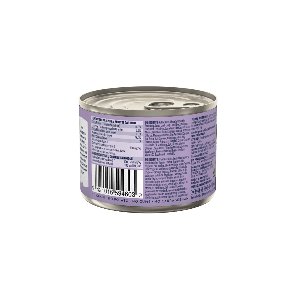 Rabbit Meat, Water Sufficient for Processing, Lamb, Lamb Lung, Lamb Liver, Chickpeas, Hare Meat, Lamb Tripe, Lamb Heart, New Zealand Green Mussel, Lamb Bone, Lamb Cartilage, Minerals (Potassium Chloride, Magnesium Sulfate, Zinc Amino Acid Complex, Iron Amino Acid Complex, Manganese Amino Acid Complex, Copper Amino Acid Complex), Choline Chloride, Dried Kelp, DL-Methionine, Salt, Taurine, Vitamins (Vitamin E Supplement, Thiamine Mononitrate, Niacin Supplement, Pyridoxine Hydrochloride, Riboflavin, Vitamin D3 Supplement, Folic Acid