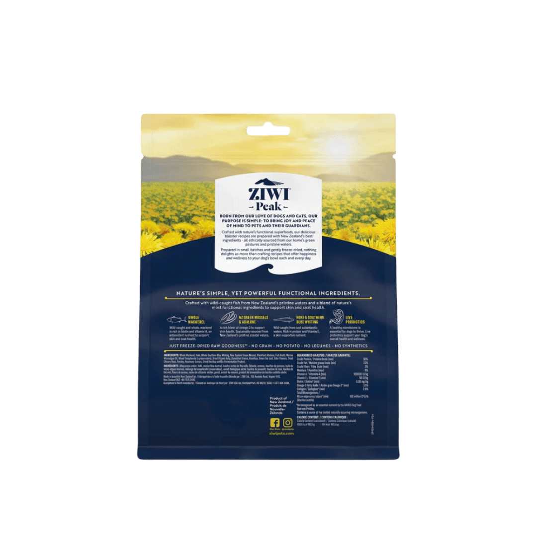 Whole Mackerel, Hoki, Whole Southern Blue Whiting, New Zealand Green Mussel, Blackfoot Abalone, Fish Broth, Marine Microalgae Oil, Mixed Tocopherols (A Preservative), Dried Organic Kelp, Dandelion Greens, Rosehips, Green Tea Leaf, Elder Flowers, Dried Chicory Root, Parsley, Rosemary Extract, Dried Bacillus Subtilis Fermentation Product, Dried Enterococcus Faecium Fermentation Product.