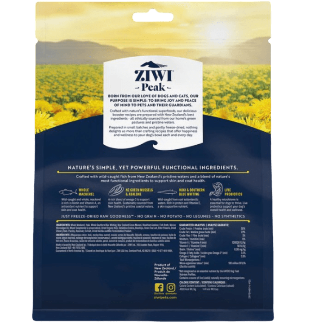 Whole Mackerel, Hoki, Whole Southern Blue Whiting, New Zealand Green Mussel, Blackfoot Abalone, Fish Broth, Marine Microalgae Oil, Mixed Tocopherols (A Preservative), Dried Organic Kelp, Dandelion Greens, Rosehips, Green Tea Leaf, Elder Flowers, Dried Chicory Root, Parsley, Rosemary Extract, Dried Bacillus Subtilis Fermentation Product, Dried Enterococcus Faecium Fermentation Product.