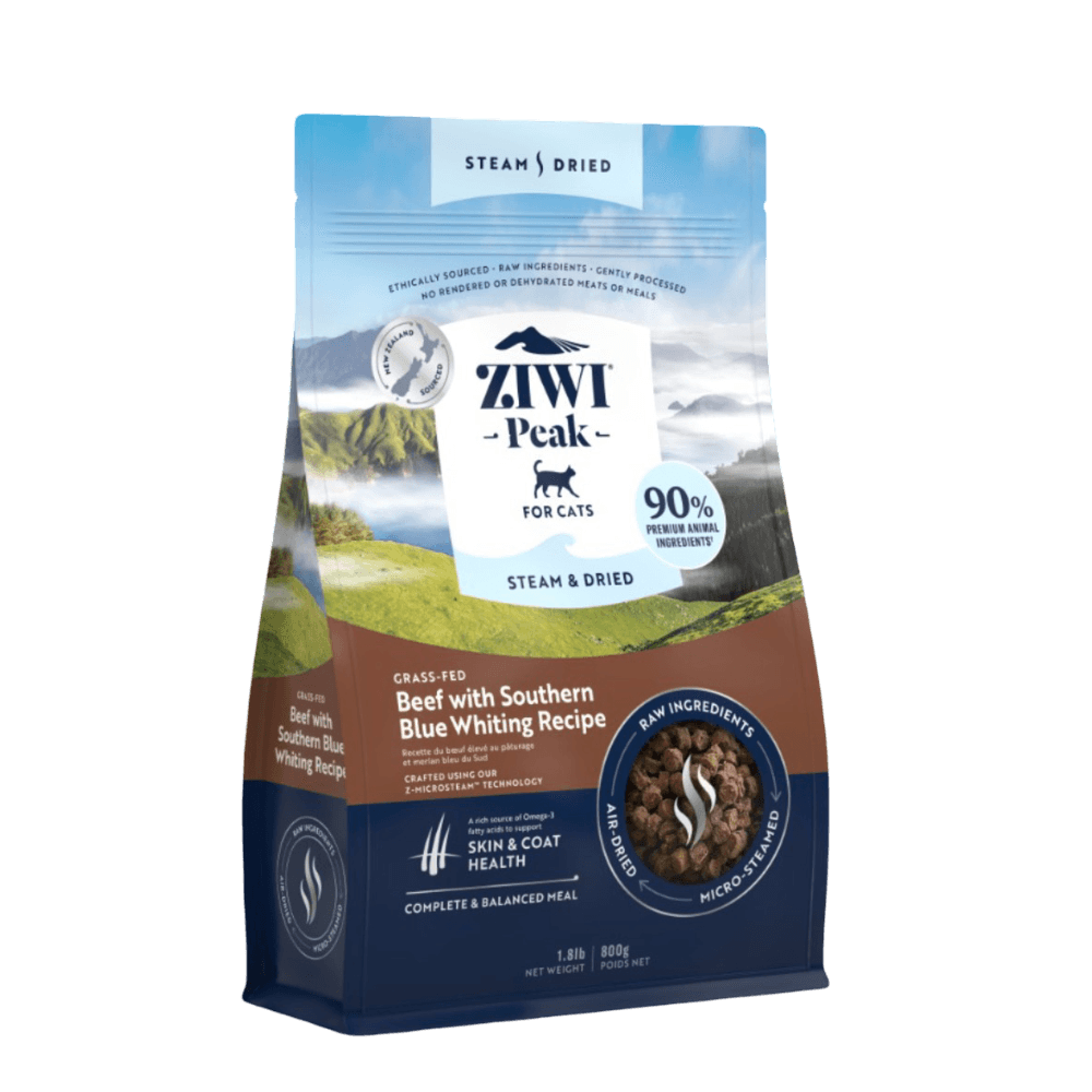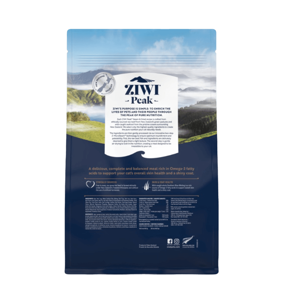 ZIWI Peak Steam & Dried Beef with Southern Blue Whiting Dry Cat Food is a premium, nutrient-packed meal designed to deliver the highest quality nutrition for your cat. Combining the rich flavours of ethically sourced, grass-fed beef with wild-caught Southern Blue Whiting, this recipe offers a perfect balance of protein, omega-3 fatty acids, and essential nutrients. ZIWI Peak's unique Z-MicroSteam's technology gently steams and air-dries the ingredients to lock in all the natural goodness, creating a delicious, wholesome meal that supports your cat's overall health, skin, and coat.