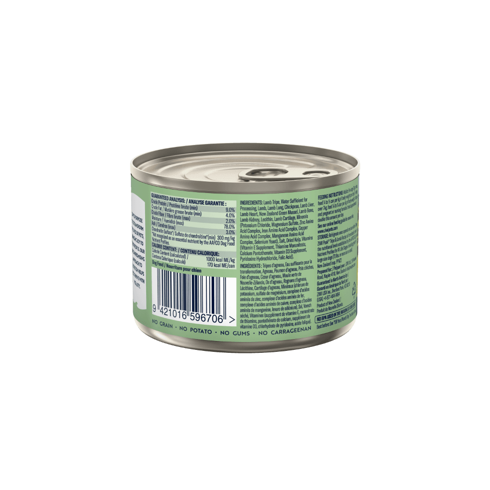 ZIWI Peak Tripe & Lamb Wet Dog Food is a highly palatable and nutrient-dense recipe crafted for dogs who thrive on a natural, meat-rich diet. It features free-range, grass-fed lamb and nutrient-rich green tripe sourced from New Zealand to support digestive health, joint function, and overall vitality. This complete and balanced meal is perfect for dogs of all life stages, especially fussy eaters or those with food sensitivities.