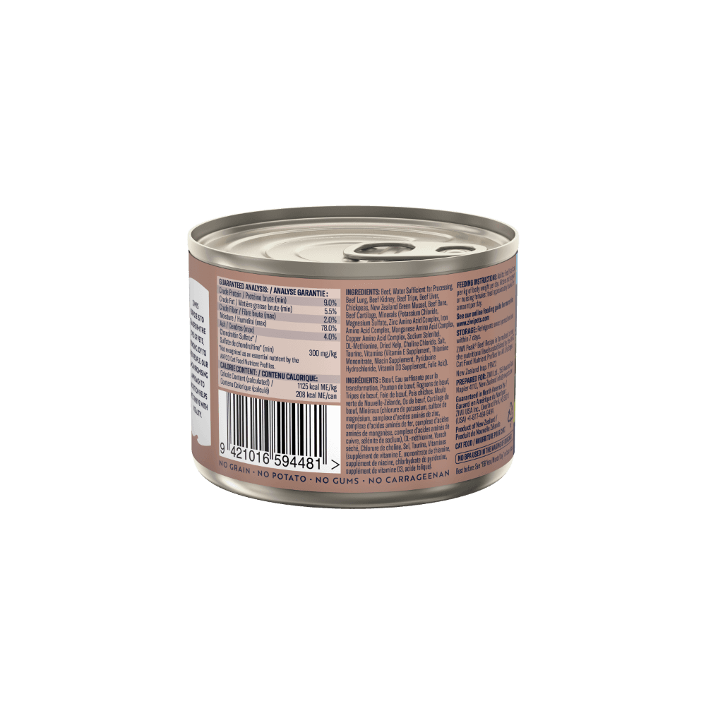 Beef, Water Sufficient for Processing, Beef Lung, Beef Kidney, Beef Tripe, Beef Liver, Chickpeas, New Zealand Green Mussel, Beef Bone, Beef Cartilage, Minerals (Potassium Chloride, Magnesium Sulfate, Zinc Amino Acid Complex, Iron Amino Acid Complex, Manganese Amino Acid Complex, Copper Amino Acid Complex, Sodium Selenite), DL-Methionine, Dried Kelp, Choline Chloride, Salt, Taurine, Vitamins (Vitamin E Supplement, Thiamine Mononitrate, Niacin Supplement, Pyridoxine Hydrochloride, Vitamin D3 Supplement, Folic Acid)