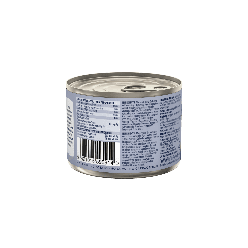 Mackerel, Water Sufficient for Processing, Chickpeas, New Zealand Green Mussel, Minerals (Potassium Chloride, Magnesium Sulfate, Zinc Amino Acid Complex, Iron Amino Acid Complex, Manganese Amino Acid Complex, Copper Amino Acid Complex), Dried Kelp, Choline Chloride, Taurine, Vitamins (Vitamin E Supplement, Thiamine Mononitrate, Niacin Supplement, Pyridoxine Hydrochloride, Riboflavin, Vitamin D3 Supplement, Folic Acid