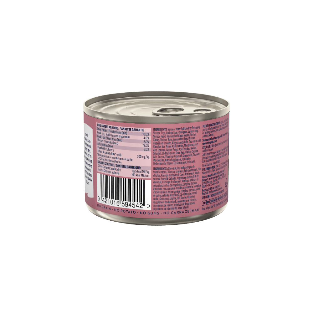 Venison, Water Sufficient for Processing, Venison Tripe, Venison Liver, Chickpeas, Venison Lung, Venison Heart, New Zealand Green Mussel, Venison Kidney, Venison Bone, Venison Cartilage, Minerals (Potassium Chloride, Magnesium Sulfate, Zinc Amino Acid Complex, Iron Amino Acid Complex, Manganese Amino Acid Complex, Copper Amino Acid Complex, Sodium Selenite), DL-Methionine, Dried Kelp, Choline Chloride, Salt, Taurine, Vitamins (Vitamin E Supplement, Thiamine Mononitrate, Niacin Supplement, Pyridoxine Hydrochloride, Vitamin D3 Supplement, Folic Acid)