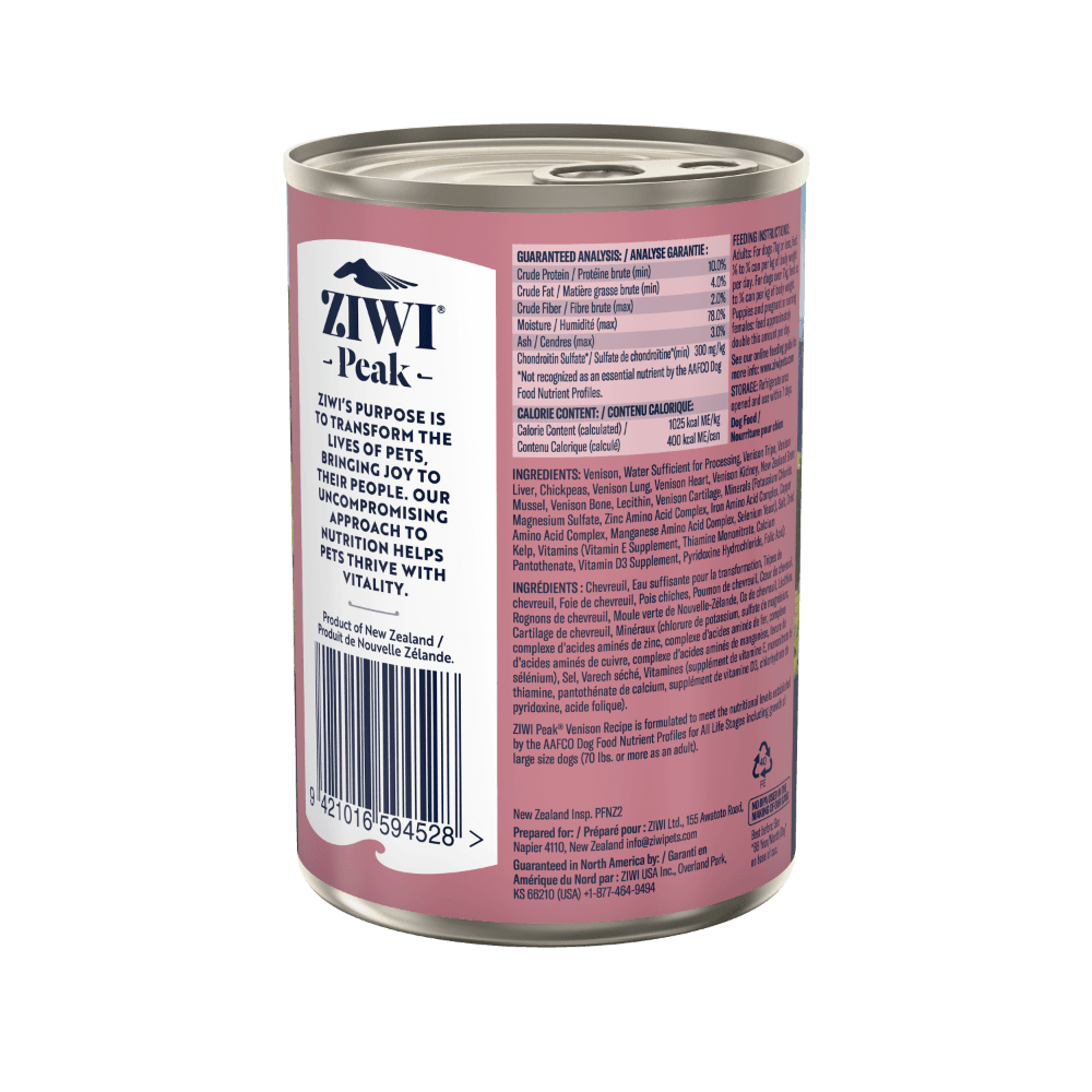 ZIWI Peak Venison Wet Dog Food is a nutrient-dense, limited-ingredient meal made with 91% free-range venison, organs, and bone. Naturally rich in protein and gentle on sensitive tummies, it includes New Zealand green mussels for joint support and omega-rich skin and coat benefits. Grain-free and ethically crafted in New Zealand, it's perfect as a complete meal or a tasty topper for dogs of all life stages.
