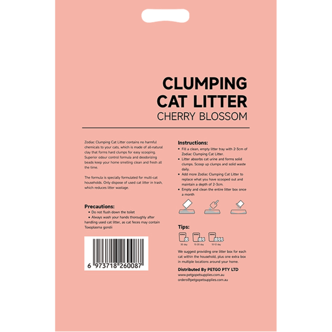 Zodiac Clumping Cat Litter harnesses odour-neutralising power with a delicate Cherry Blossom scent, creating a fresh and pleasant environment for your cat. As an eco-conscious choice, it offers high performance and sustainability, ensuring both pet comfort and environmental care.