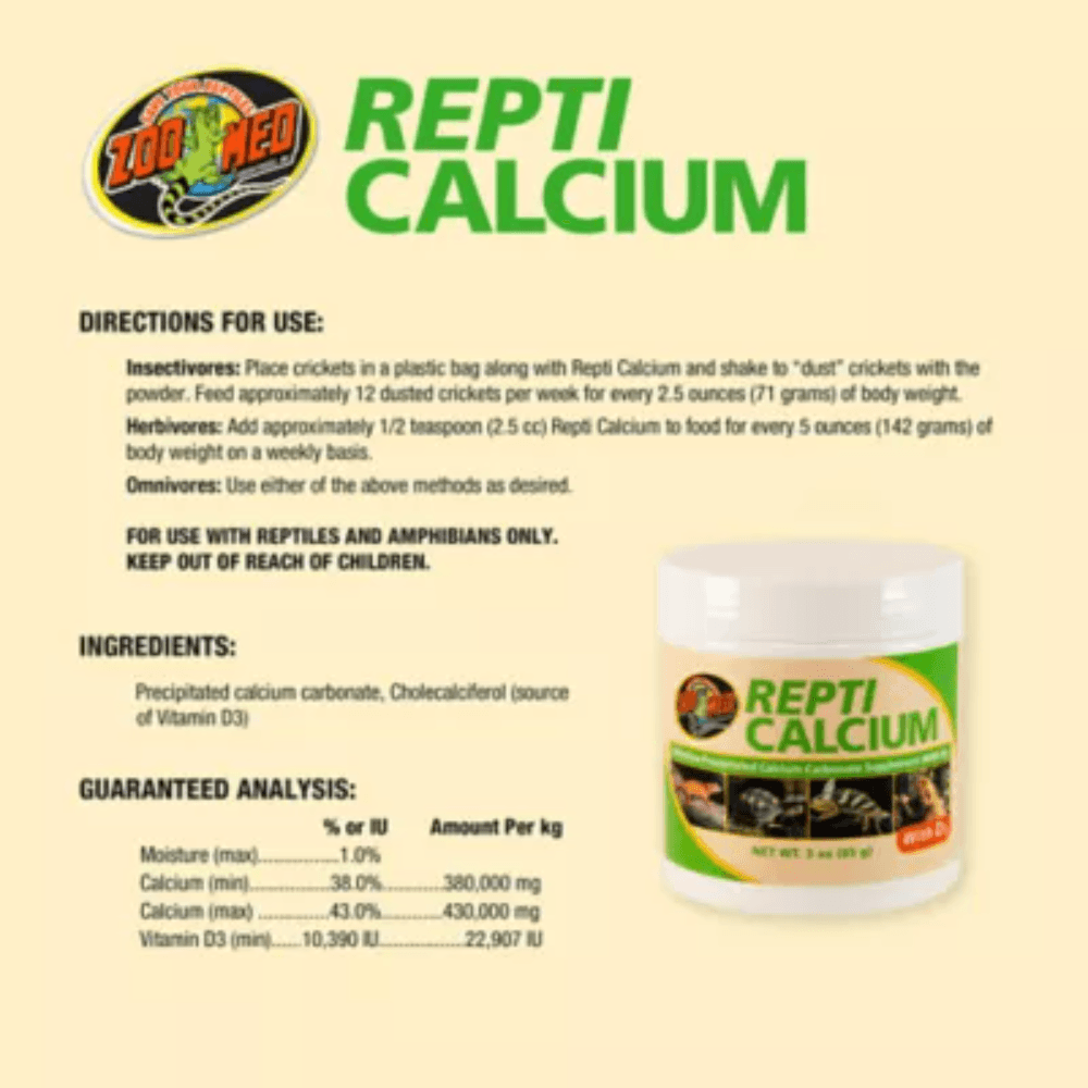 This ultra-fine precipitated calcium carbonate supplement has been formulated with Vitamin D3 for additional health benefits. Its a phosphorus-free calcium supplement for reptiles and amphibians with a unique shape and high surface area per gram, resulting in increased calcium bio-availability.